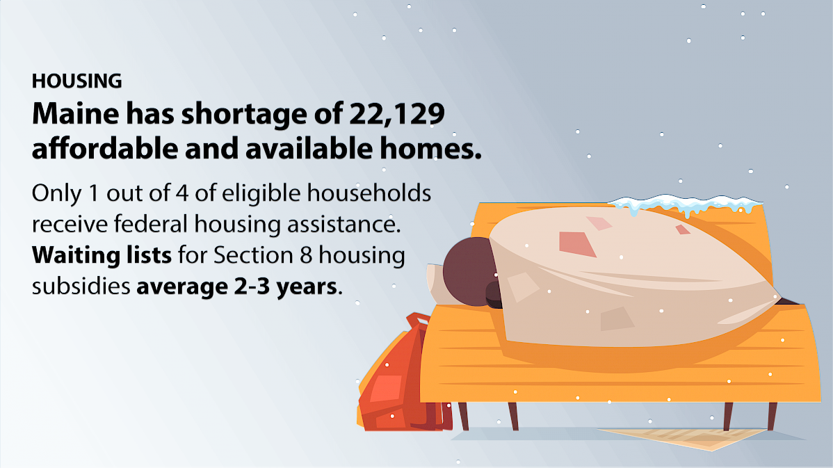 To ensure affordability, Maine needs a fully funded state housing assistance program that mirrors the federal housing choice voucher program, which provides temporary assistance to all eligible applicants on housing authority waiting lists in Maine for either public housing or housing choice vouchers. This program should also include those households that are typically ineligible for the federal housing choice voucher for reasons other than income, such as immigration status or conviction record. Discriminatory industry practices against low-income renters and people who use drugs and their loved ones must be prohibited, and exclusionary government policy that prevents the development of new affordable housing in middle and high-income communities must be repealed. Instead, state and federal programs should foster and encourage development of affordable housing across Maine’s communities. To further promote inclusion, the board of every housing authority and nonprofit housing corporation in Maine should maintain a minimum proportion of 1/3 directors that are either low-income tenants and/or people from protected classes under federal Fair Housing law and Maine Human Rights law, and must enact a diversity, equity, and inclusion plan that continually assesses and improves the organization's leadership, protocols, and practice outcomes. To reduce displacement, tenant rights and protections must be strengthened to include rent stabilization, an eviction diversion program, tenant opportunity to purchase policies and laws, and an end to no-cause evictions.